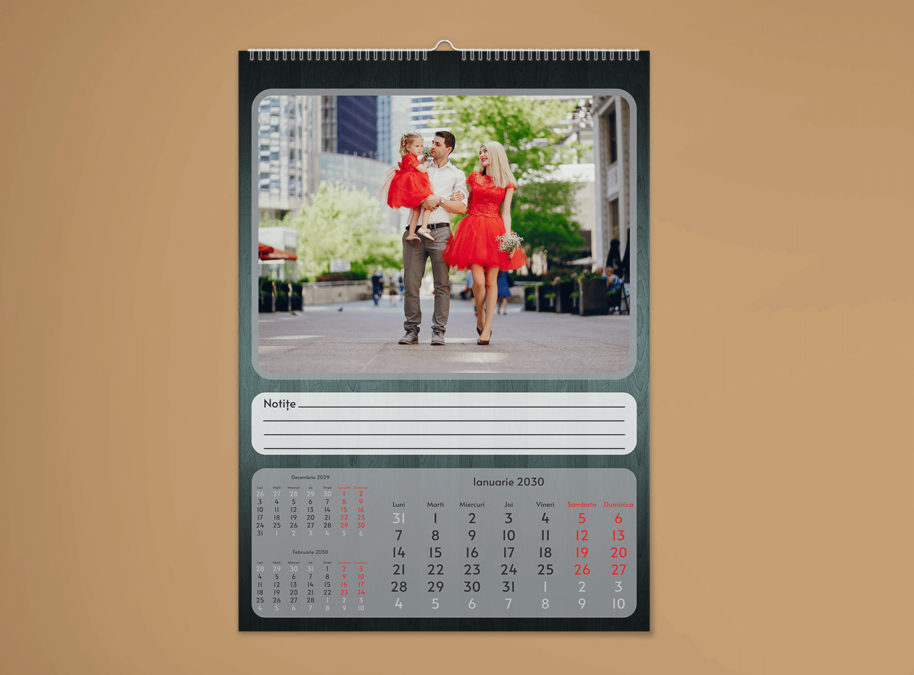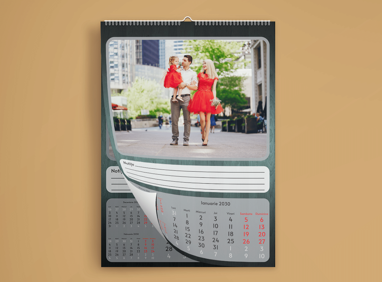 Descoperă bucuria de a crea amintiri neprețuite pentru familia ta cu calendarele personalizate, ce îmbină eleganța și originalitatea prin utilizarea a 12 poze unice, fiecare imprimată cu tehnologie UV sau Digitală de înaltă calitate.