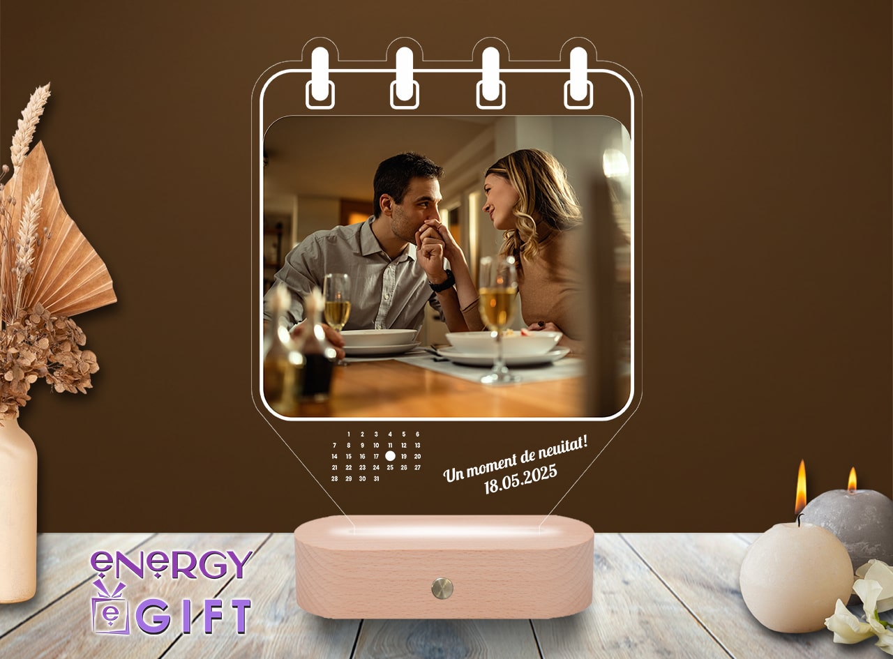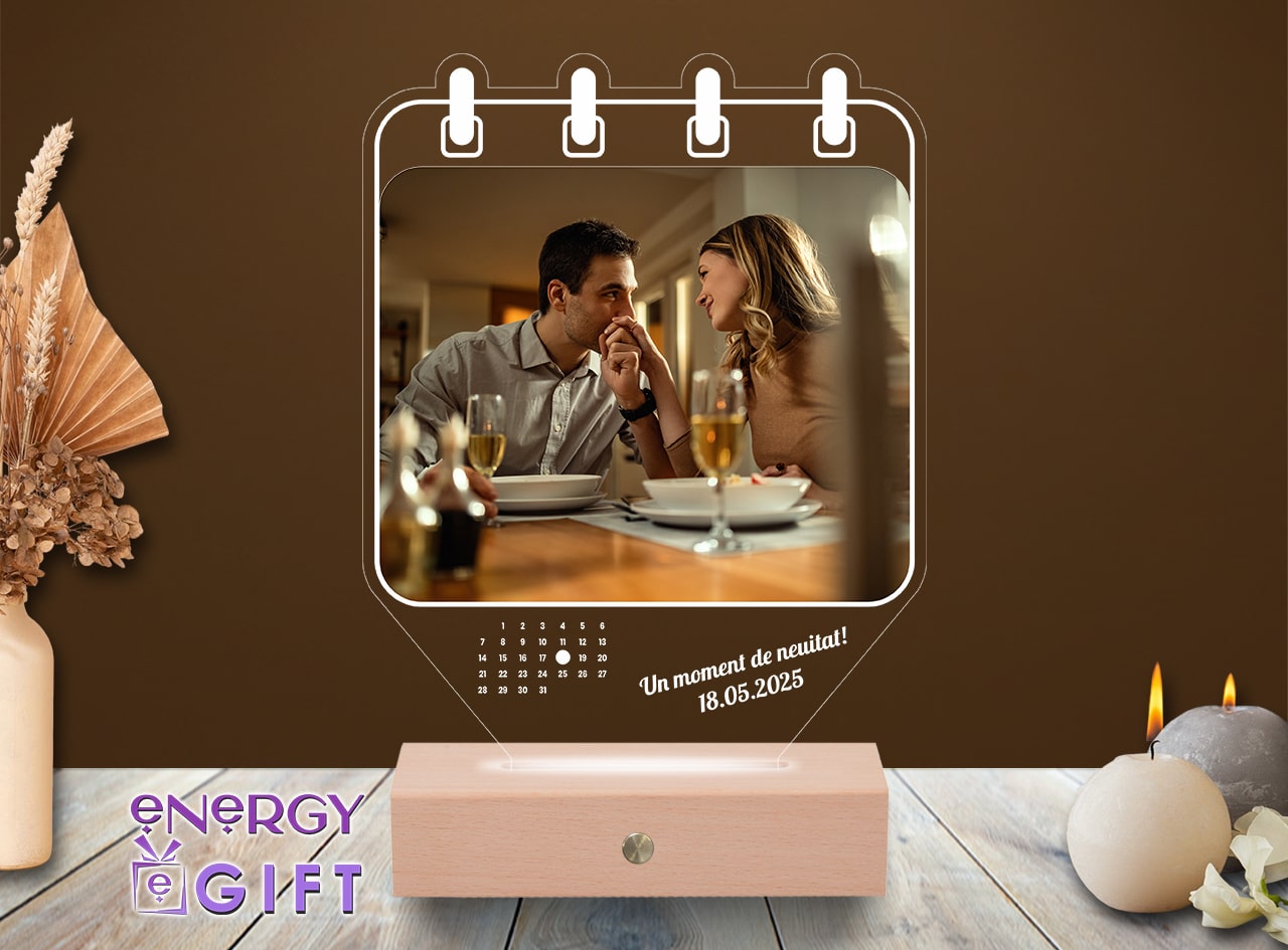 Transformă o zi importantă într-un decor cu suflet. Lampa LED Calendar poate fi personalizată cu poza voastră preferată, o dată specială din viața voastră și un mesaj care contează. Un cadou elegant, plin de emoție pentru cei dragi.