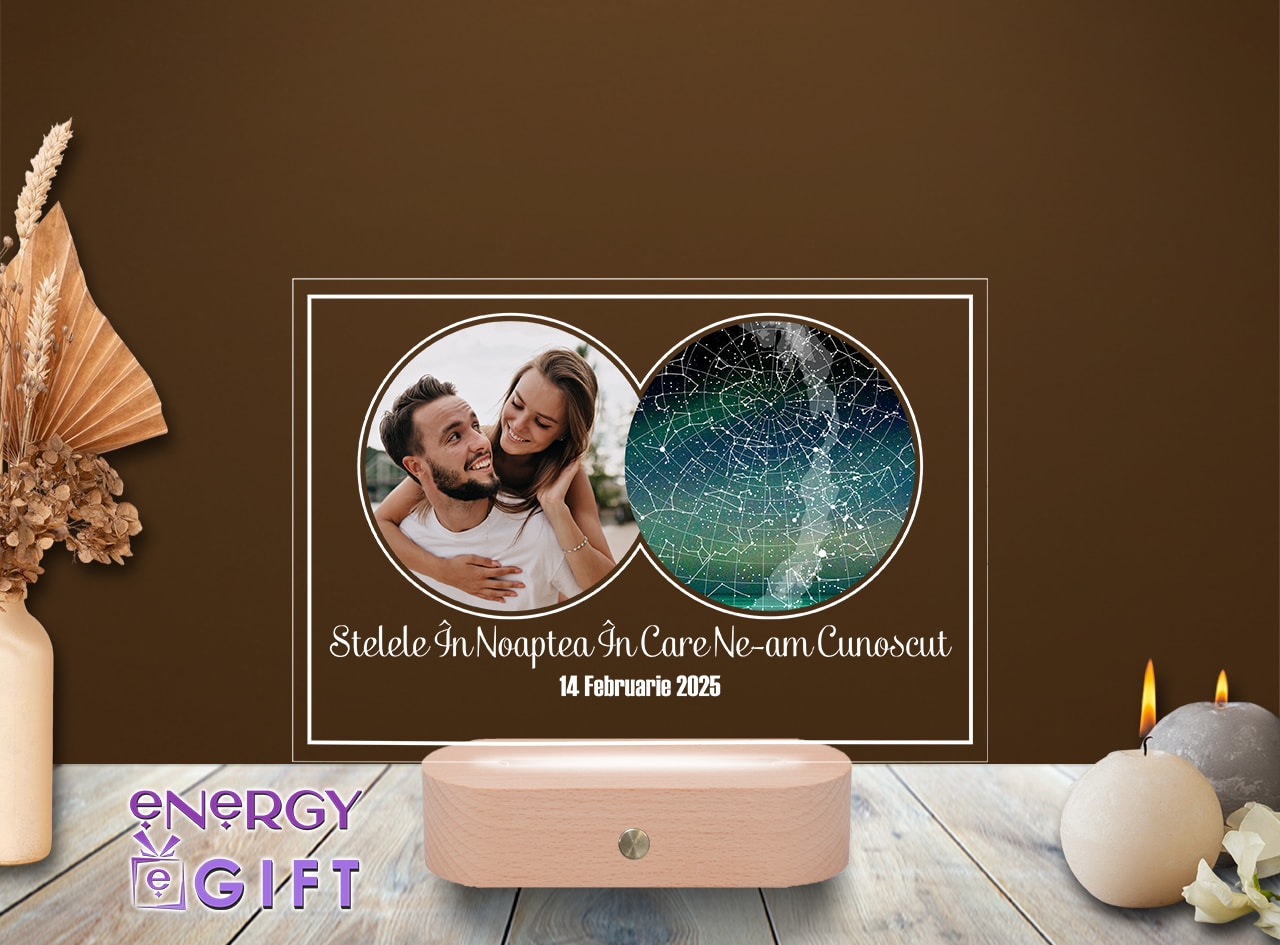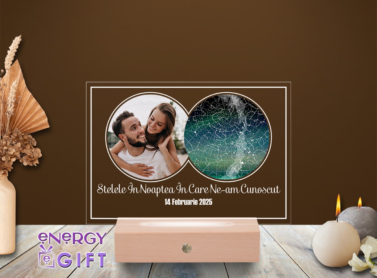 Lampa LED 3D cu constelație personalizată surprinde poziția exactă a stelelor dintr-un moment unic pentru tine. Adaugă un mesaj și transform-o într-un cadou simbolic, ideal pentru aniversări, nașteri sau începuturi de poveste.
