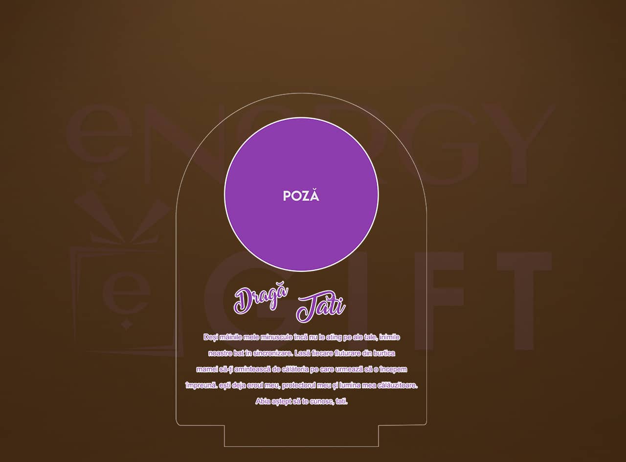 Încântați-vă cu lumina caldă și atmosfera magică pe care o aduce lampa LED 3D de la EnergyGift. Descoperiți colecția noastră diversificată de lămpi personalizate, fiecare dintre ele fiind o declarație de eleganță și stil, perfectă pentru orice încăpere.