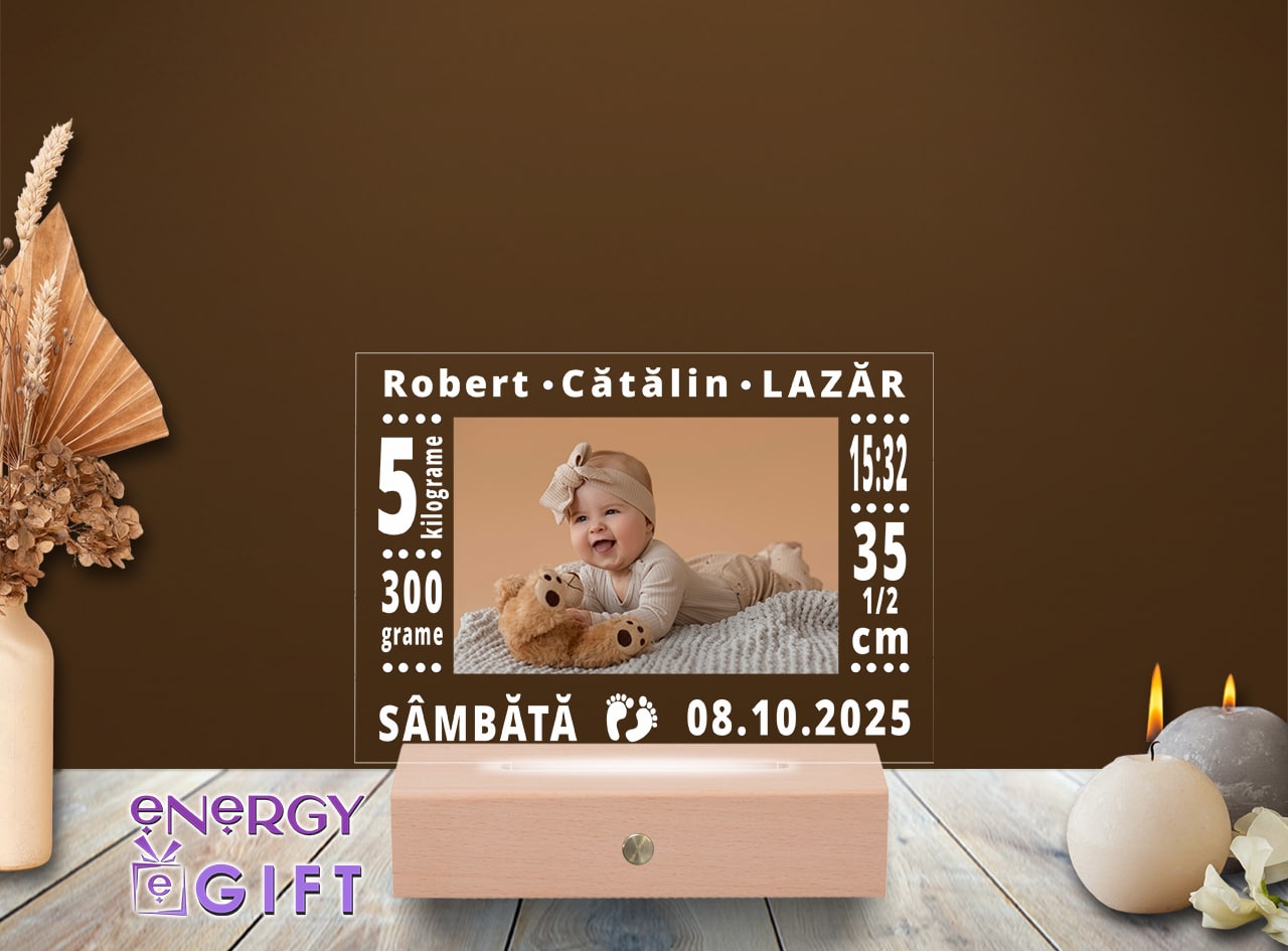 Transformă primul moment al vieții într-o amintire luminoasă. Această lampă LED include toate detaliile importante de la naștere – perfectă pentru camera bebelușului sau ca dar de botez.