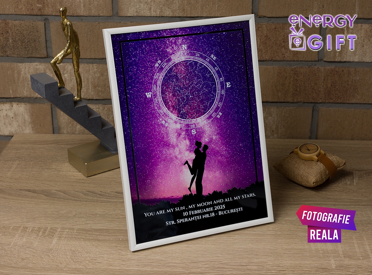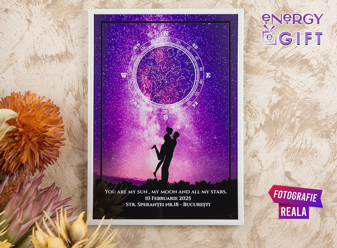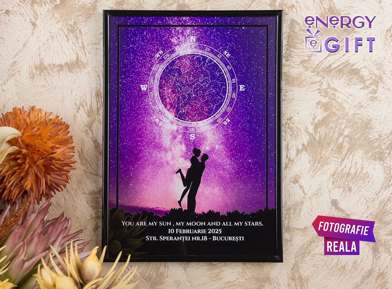 Un tablou constelație elegant care redă cerul exact dintr-un moment special al familiei tale. Imprimat pe PVC lucios cu print UV 1200 dpi, oferă un efect vizual rafinat. Un cadou personalizat de suflet, ideal pentru aniversări, nașteri sau casă nouă – artă decorativă care unește emoțiile în lumină, semnată EnergyGift.