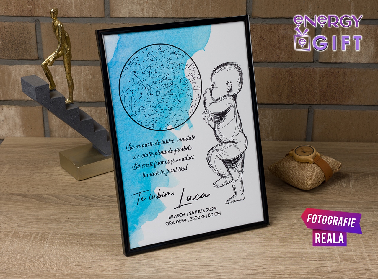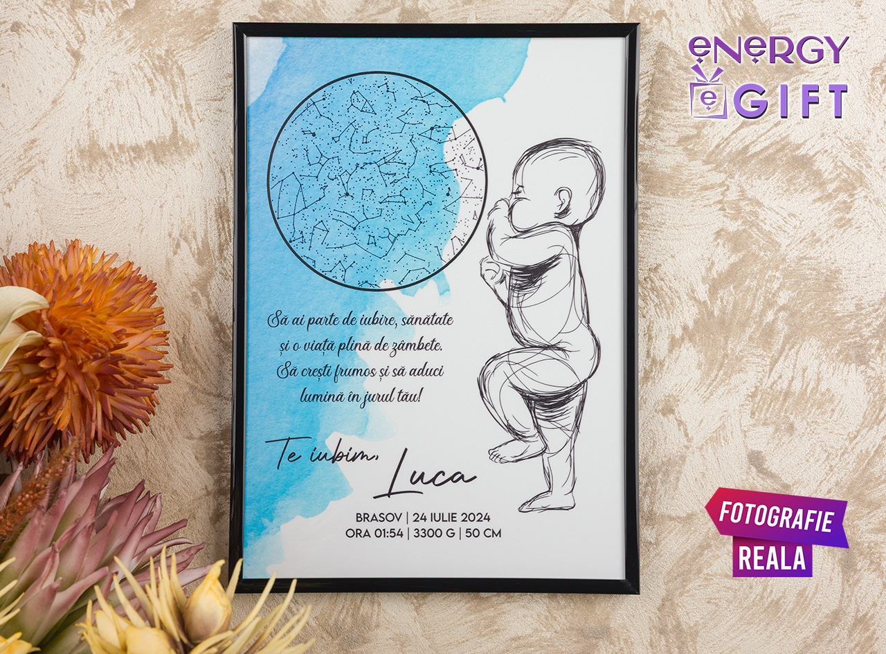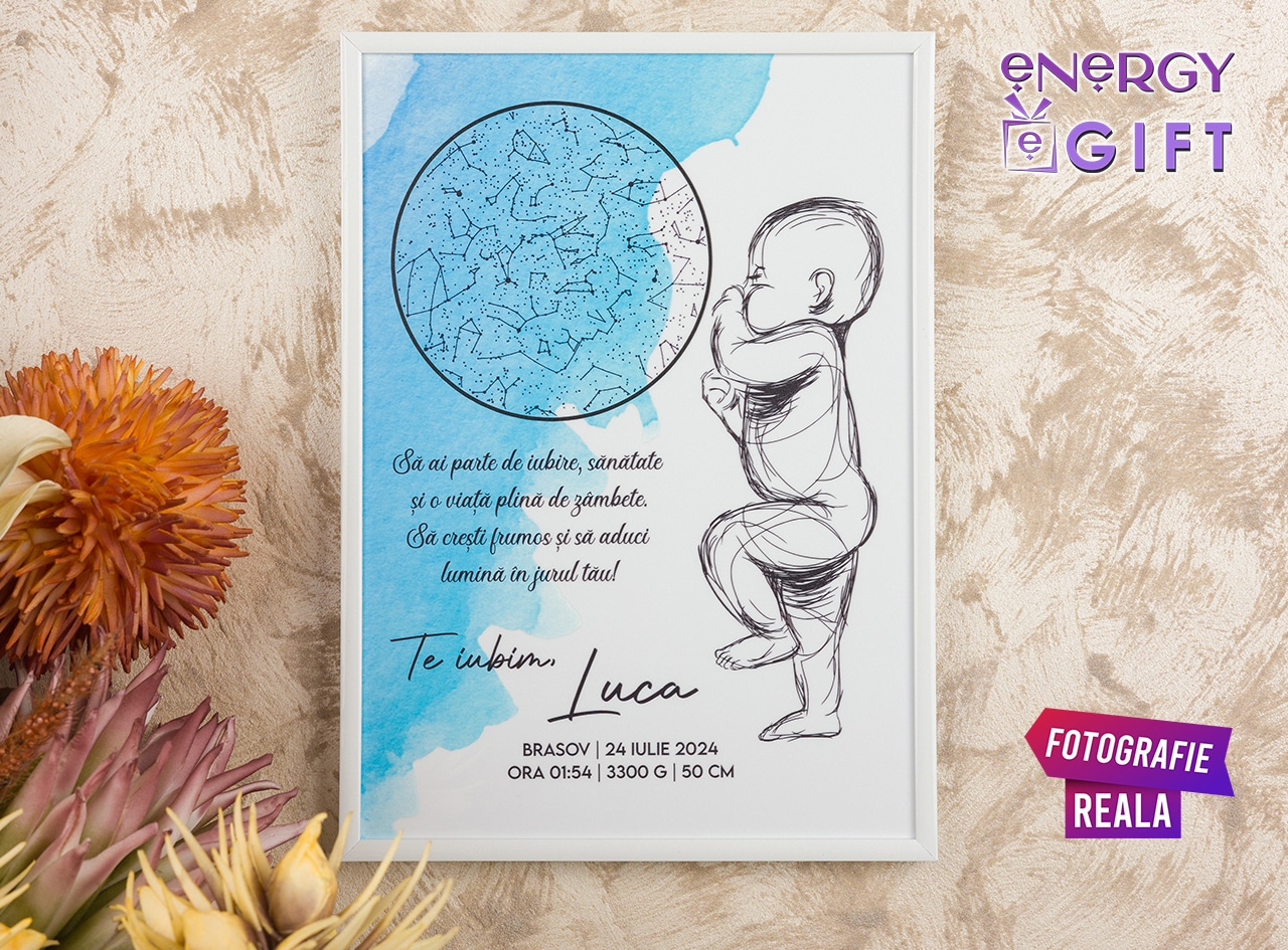 Un tablou constelație elegant, realizat prin print UV mat pe PVC lucios, care surprinde cerul exact așa cum arăta într-un moment unic din viața ta. Personalizat cu dată, oră și locație, devine o piesă decorativă modernă și un cadou cu semnificație profundă – o adevărată poveste spusă prin stele.