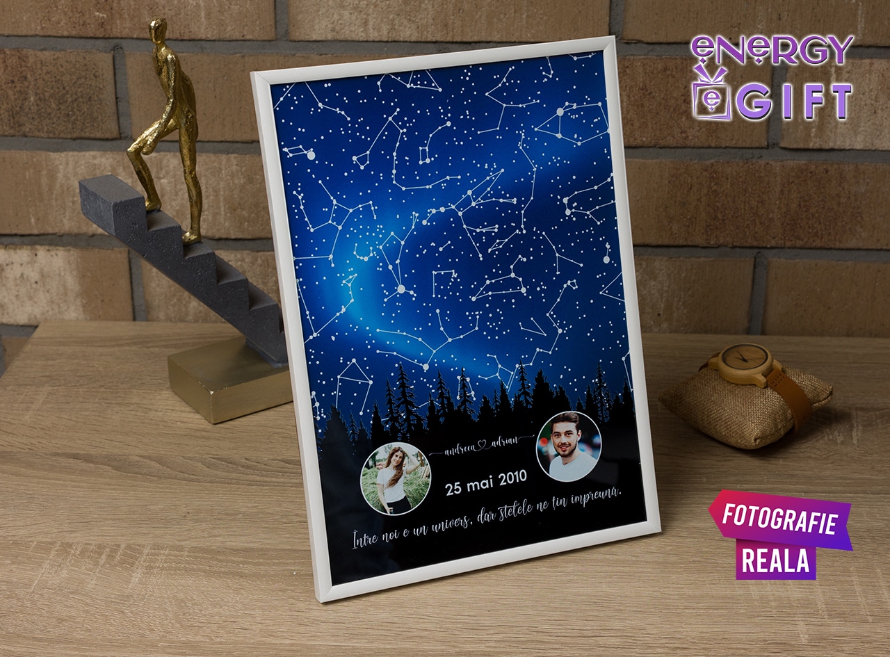 Un tablou constelație personalizat care surprinde cerul exact așa cum arăta într-un moment special din viața ta – ziua nunții, nașterea copilului, prima întâlnire sau o reușită importantă. Fiecare stea este reprodusă cu fidelitate astronomică, iar tabloul devine o amintire vizuală elegantă, care aduce emoția cerului direct în casa ta.