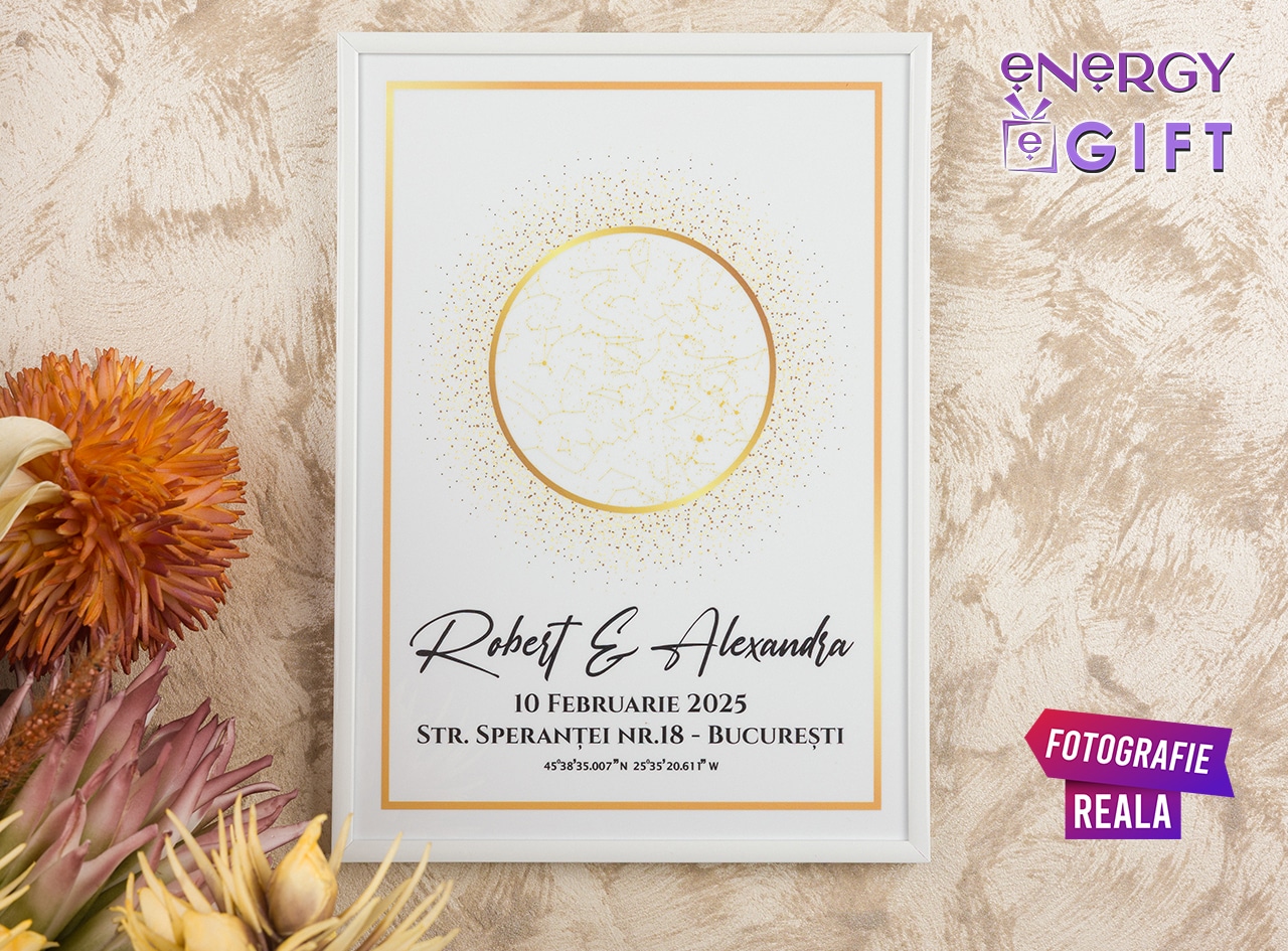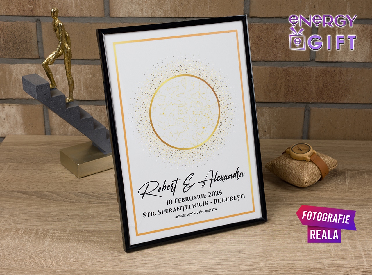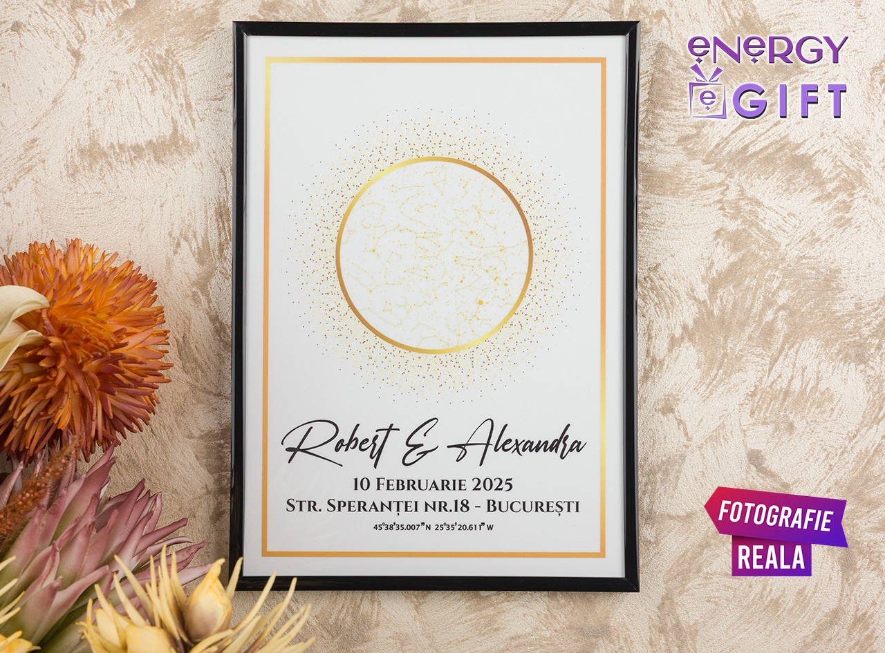 Un tablou harta stelelor elegant care redă cerul exact din momentul vostru special. Imprimat pe PVC lucios cu print UV 1200 dpi, oferă profunzime și rafinament. Un cadou romantic personalizat, perfect pentru logodnă, aniversări sau nuntă – o amintire elegantă ce spune povestea voastră, semnată EnergyGift.