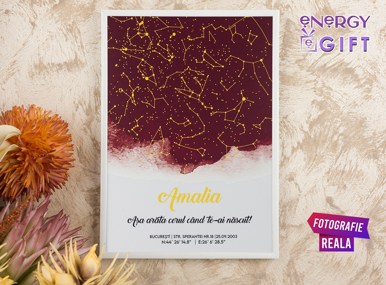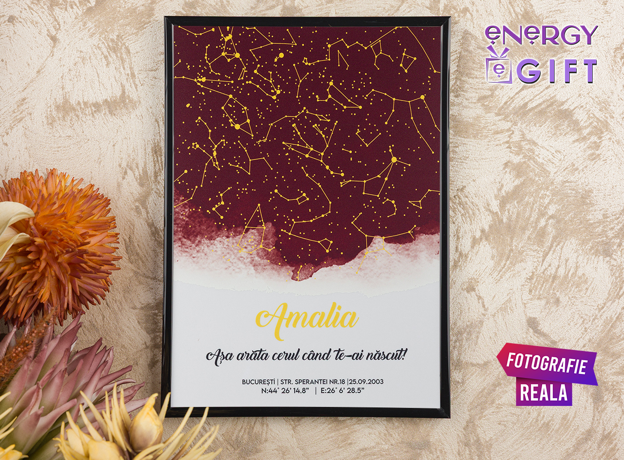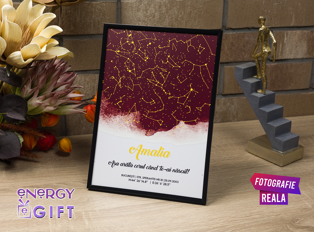 Această hartă a cerului personalizată redă cu precizie poziția reală a stelelor din ziua, ora și locația care marchează acest nou început. Fie că este vorba despre mutarea într-un nou cămin, începutul unei căsnicii, nașterea copilului sau o schimbare majoră în viață, tabloul transformă emoția în artă.