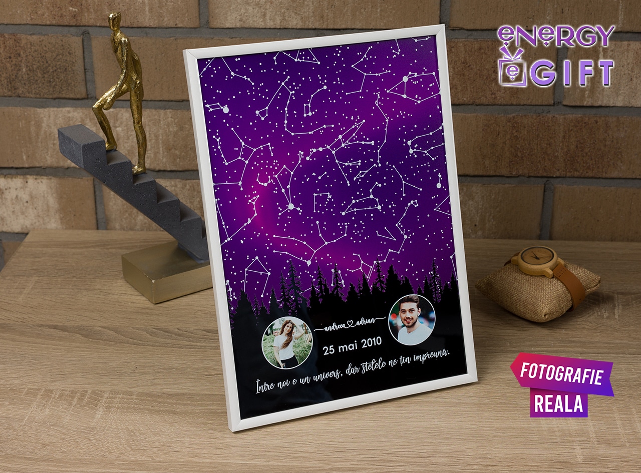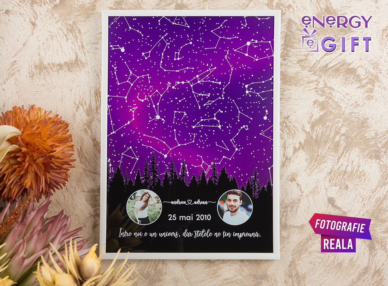 Un tablou Sky Map cu dedicație care redă cerul dintr-un moment unic al vieții tale. Personalizat cu dată, oră, locație și mesaj, devine o amintire elegantă și simbolică, un cadou romantic EnergyGift pentru aniversări, logodne, Valentine’s Day sau ocazii de neuitat. Povestea ta, scrisă în stele.