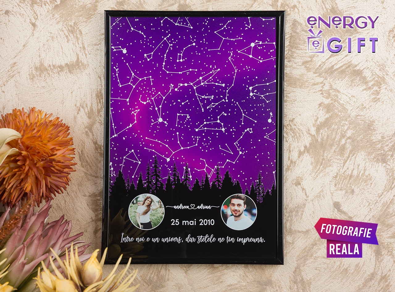 Fiecare stea este redată fidel, iar dedicația imprimată completează designul cu emoție și semnificație. Realizat prin print UV mat la 1200 dpi pe PVC ultra-lucios, tabloul combină tehnologia cu arta, oferind o strălucire elegantă și un efect de relief subtil.