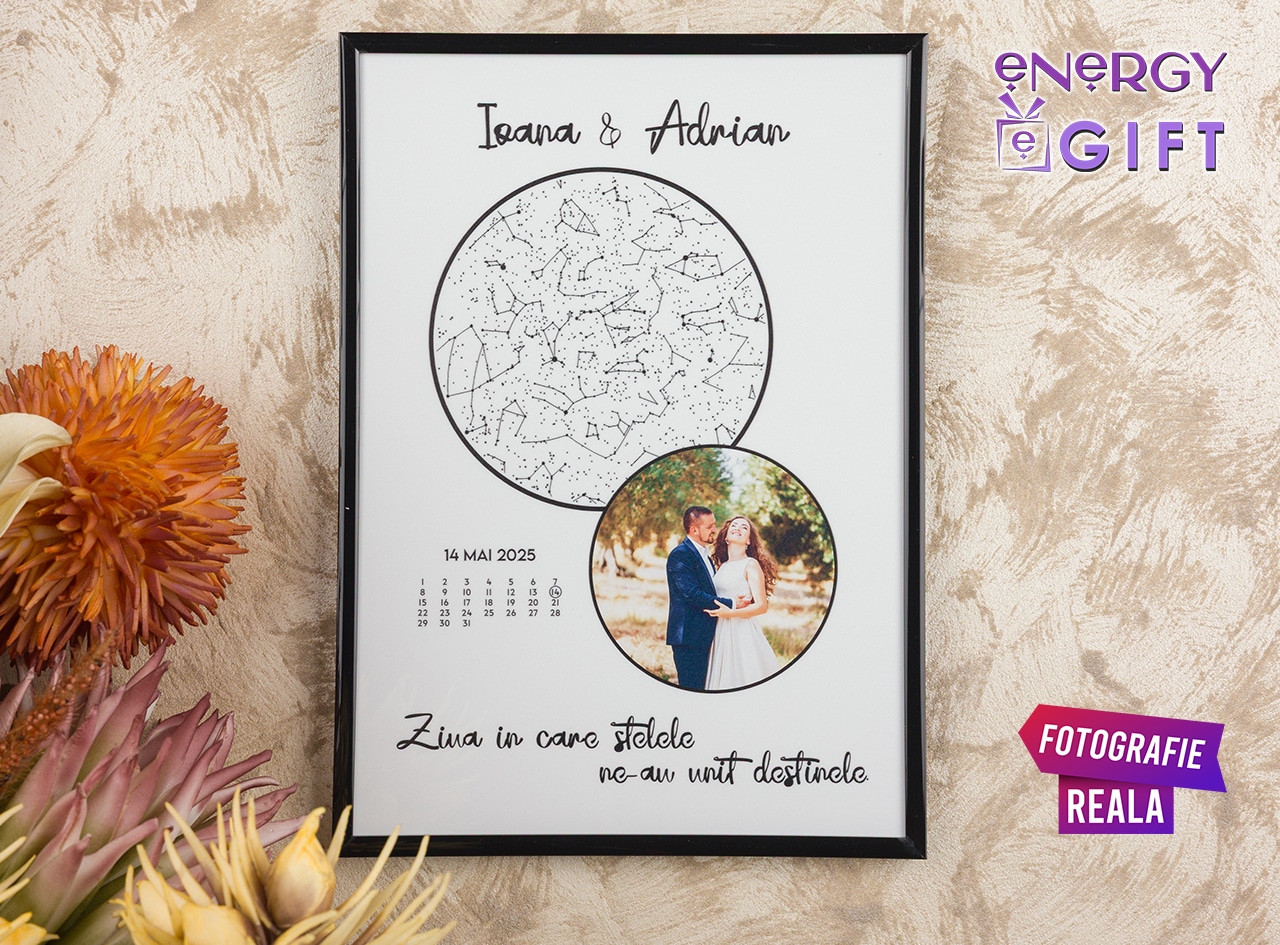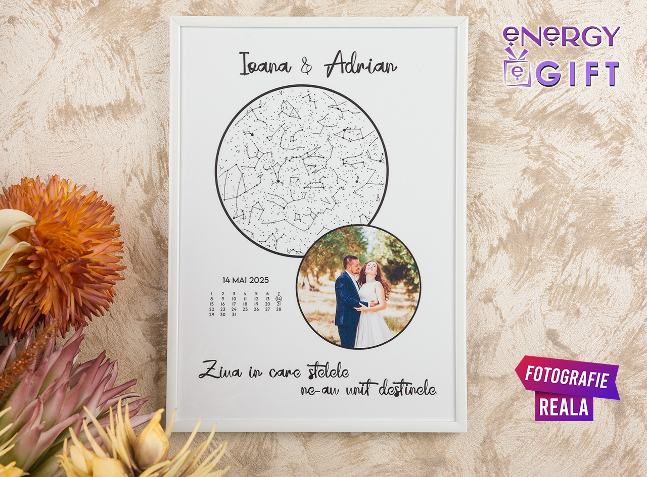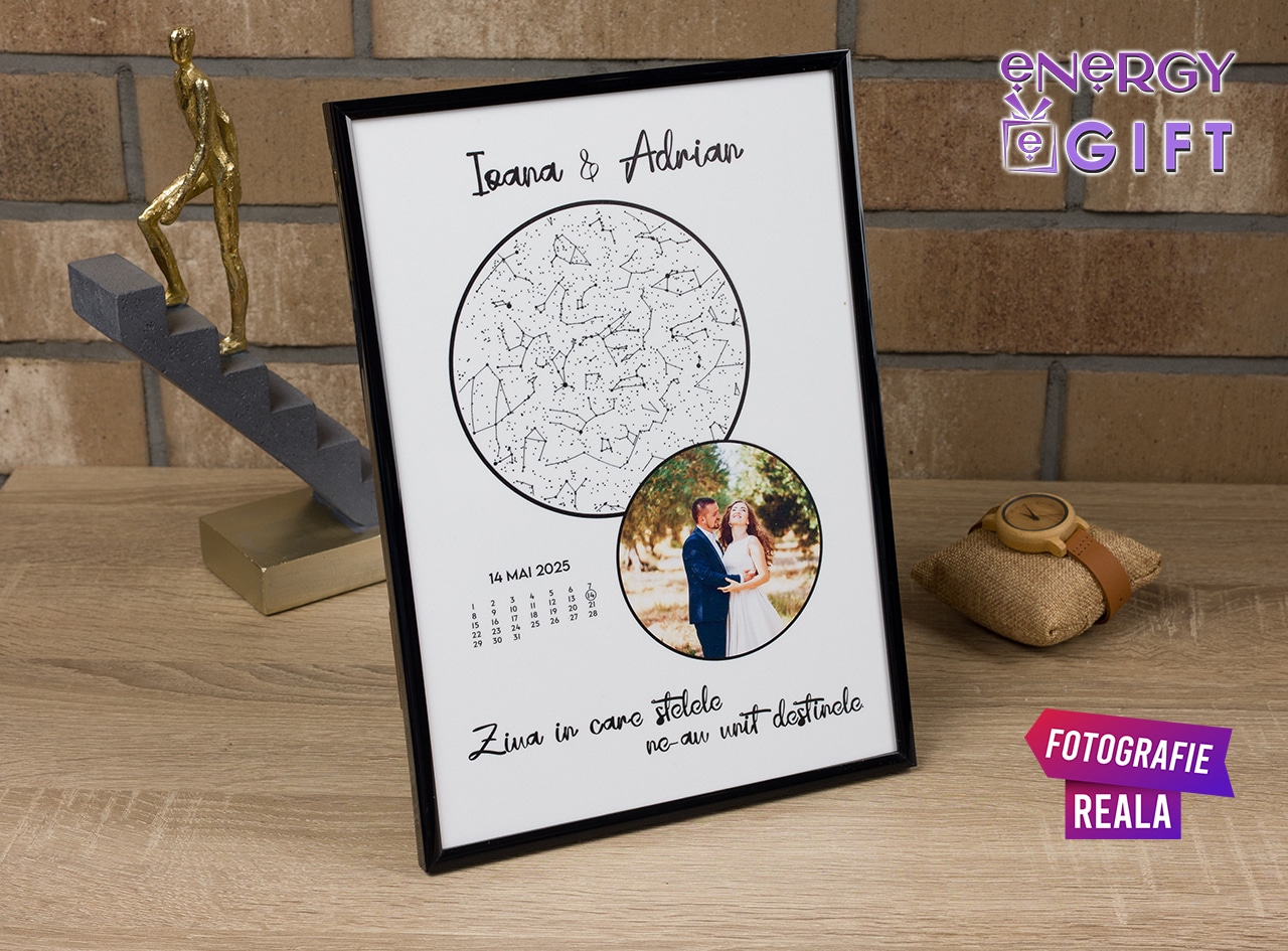 Un tablou Sky Map personalizat cu ora și locația exactă surprinde cerul așa cum arăta într-un moment unic din viața ta. Poate fi clipa în care v-ați cunoscut, o cerere în căsătorie, nașterea copilului sau un eveniment ce merită păstrat pentru totdeauna. Fiecare stea și constelație sunt redate fidel conform realității astronomice, transformând emoția momentului într-o operă de artă elegantă.